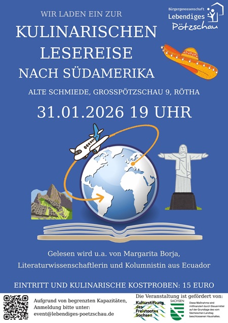 Auf dieser Kulinarischen Lesung werden die Besucher durch Leseproben aus passender Literatur auf eine Reise nach Südamerika entführt. Dazu werden Snacks, kleine Gerichte und Getränke gereicht, welche ihren Ursprung in Südamerika haben.